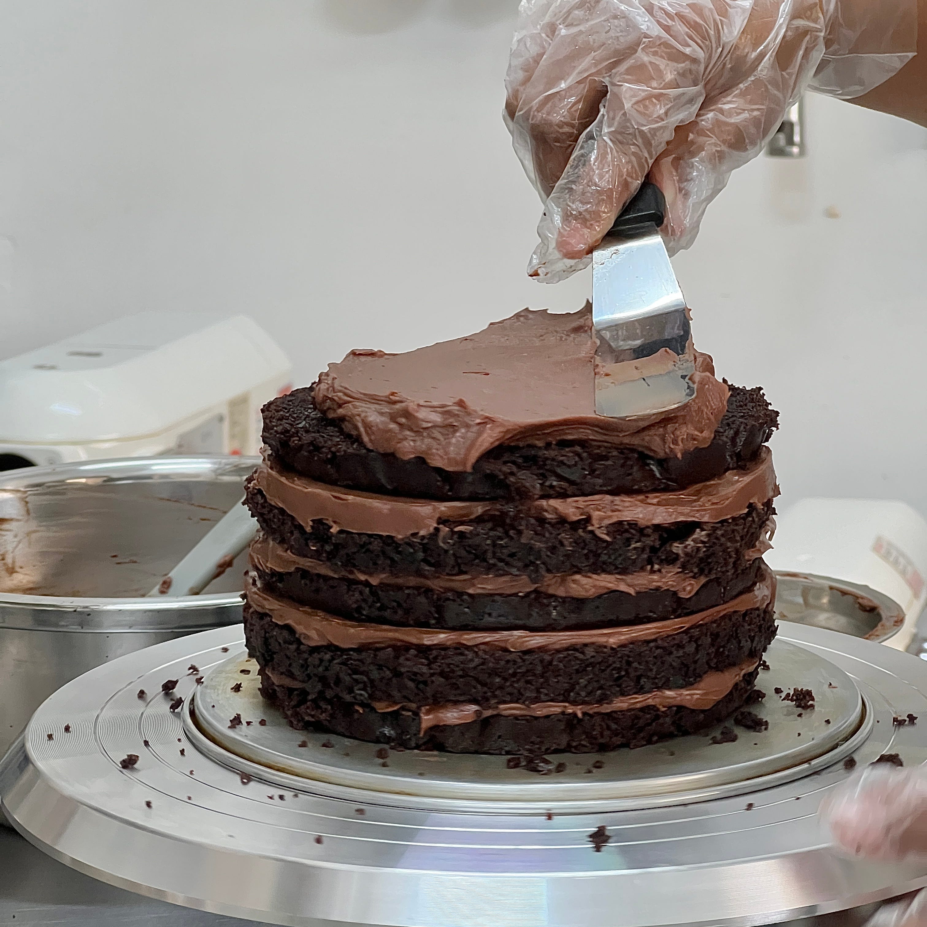 For the next layer, add 100gr of ganache. Spread evenly with an offset spatula.