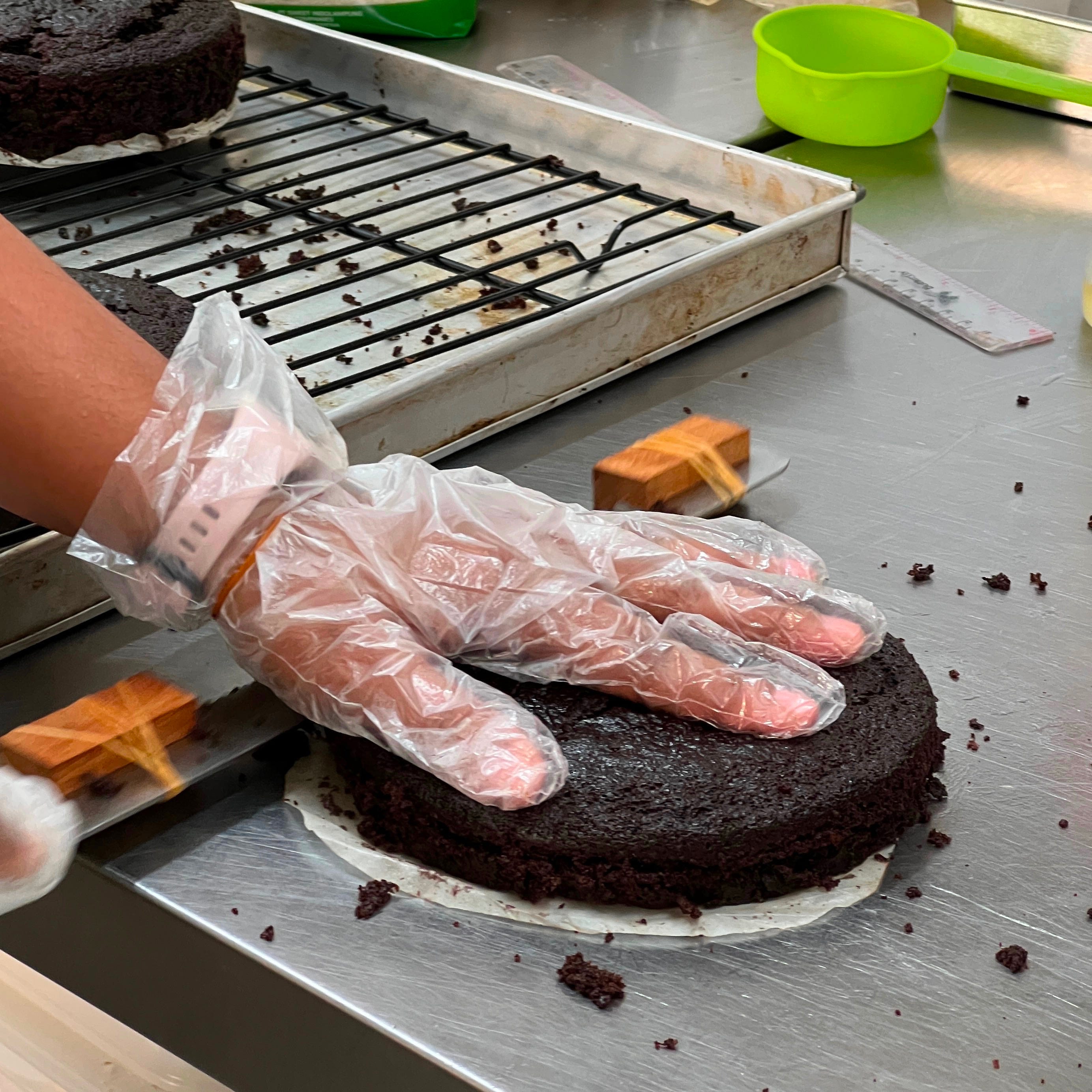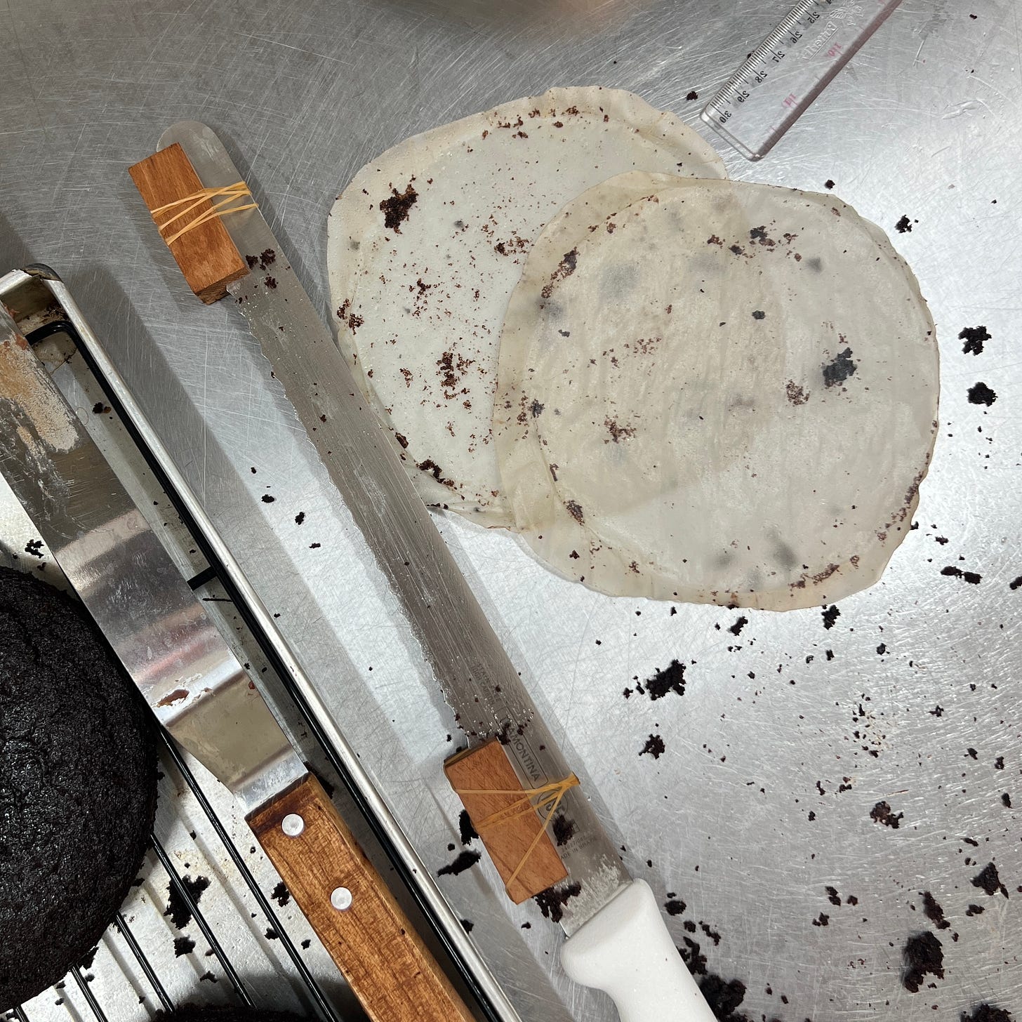 Using a 1 cm cake leveler, slice 2 layers from each pan. It won’t be an even slice-in-half, as each cake will be over 2 cm tall including the dome. I made sure to leave space to accommodate a cleaner and flatter slice.